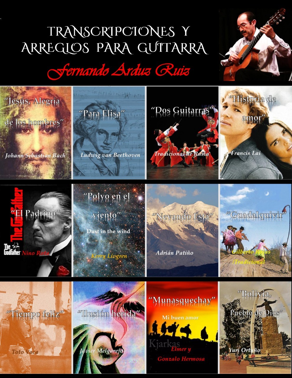 Seis partituras de Música universal para guitarra, comprende: Jesús, alegría de los hombres -J.S. Bach, Para Elisa -L.v. Beethoven, Dos guitarras -Trad. Rusia, Historia de amor -F. Lai, El Padrino -N. Rota, y Dust in the wind -K. Livgren, en arreglo guitarrístico de Fernando Arduz Ruiz.